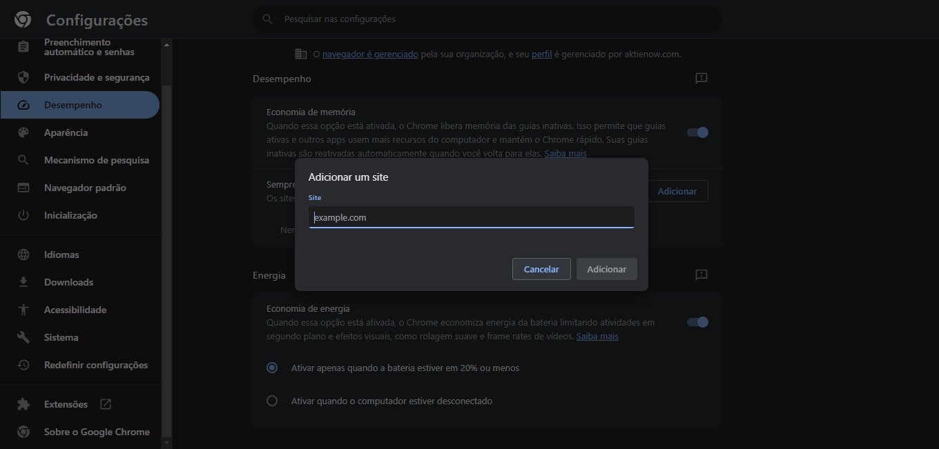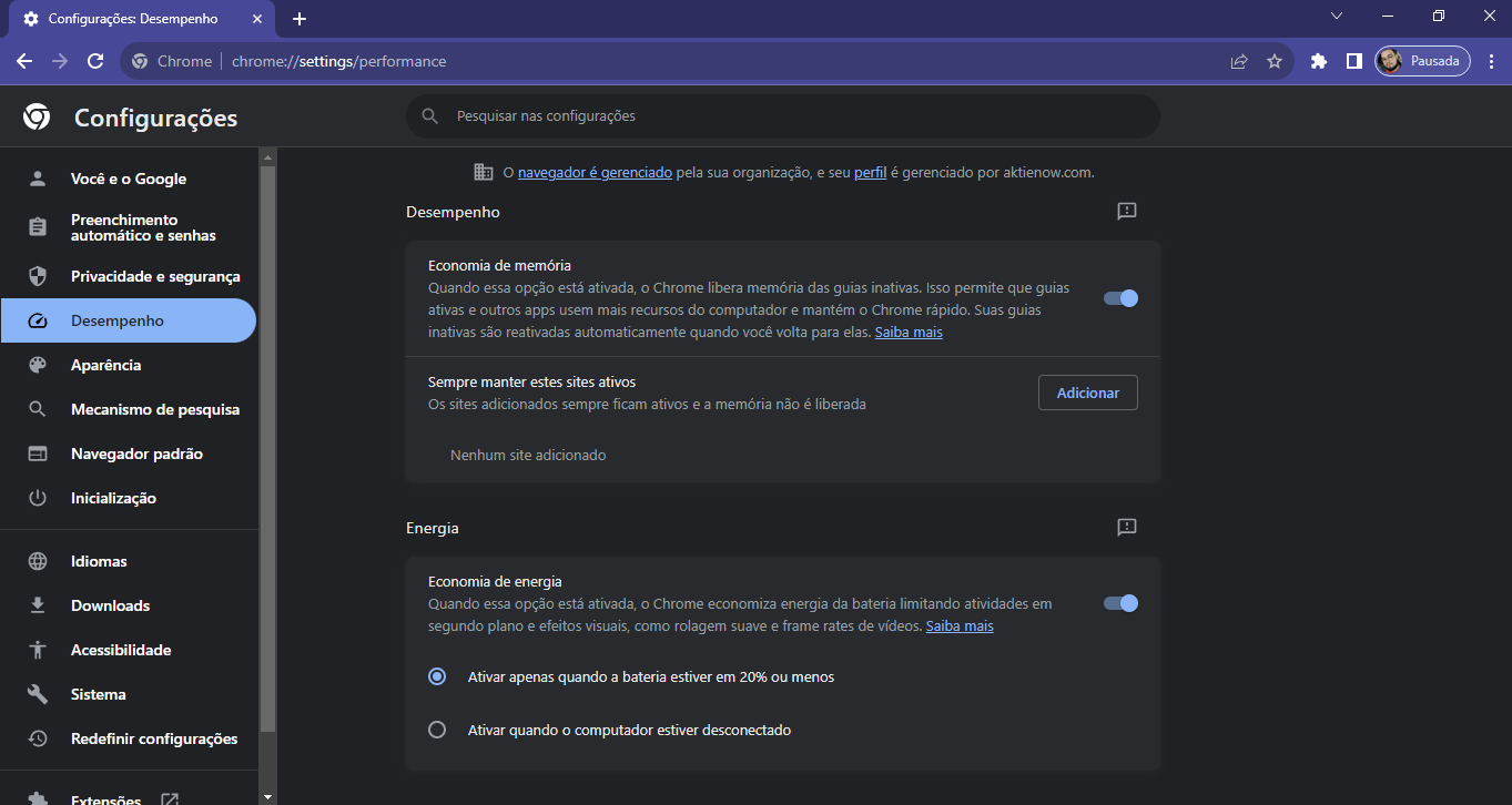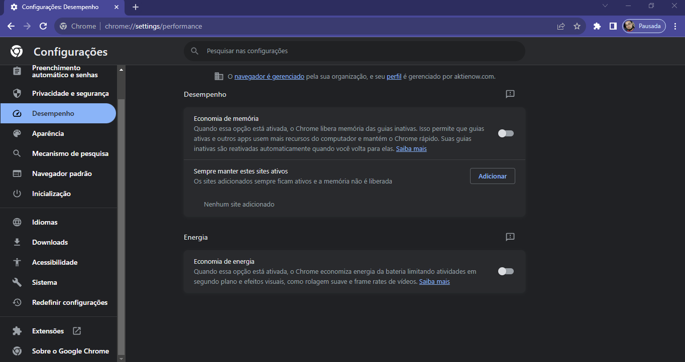Dito isso, para garantirmos que a conexão não será cortada, sugerimos que os recursos de Desempenho do navegador sejam desabilitados, uma vez que eles "congelam" as abas inativas para reduzir consumo, resultando na perda de conexão.